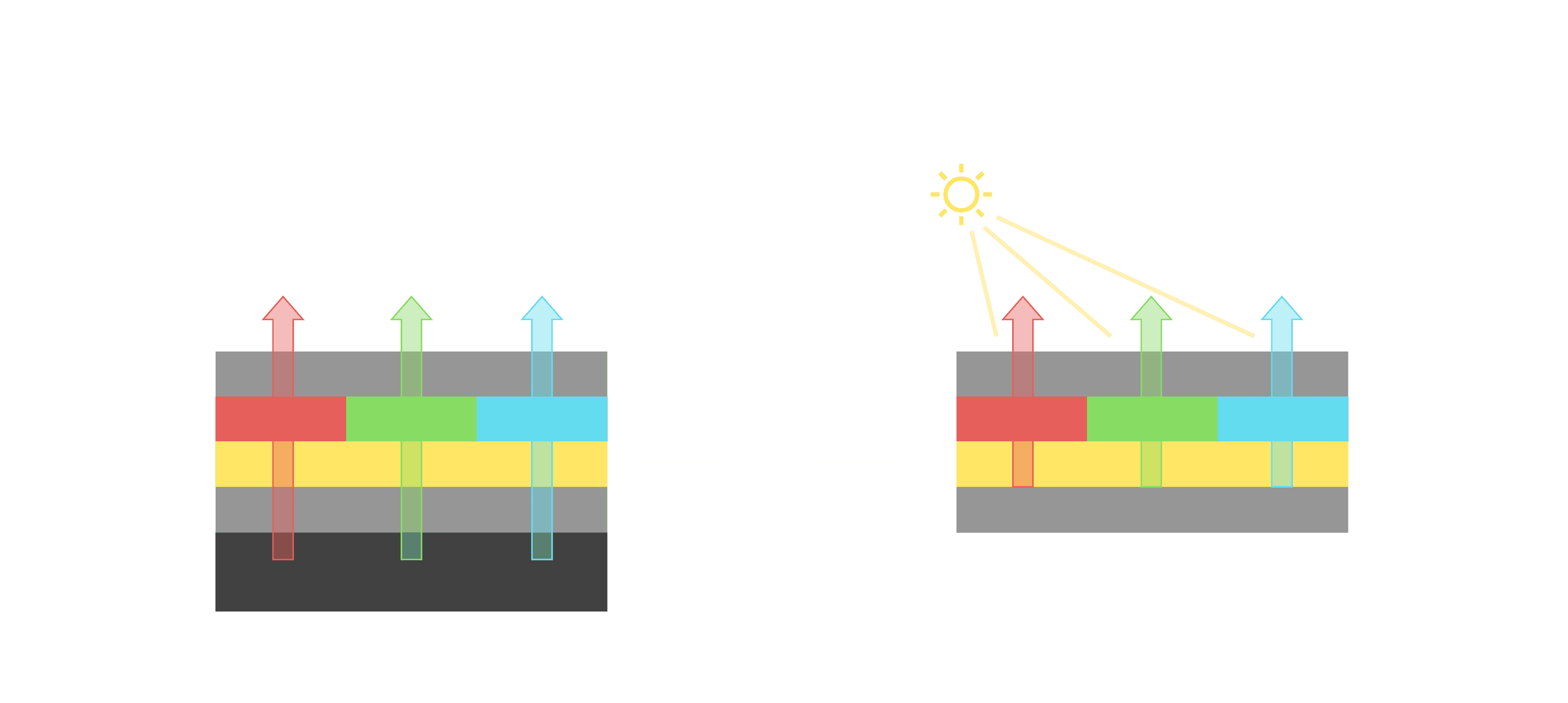 与传统需搭配背光单元的液晶显示相比,,反射式液晶技术不仅更省电、、、、更轻薄,,,,且即便在艳阳下仍能清晰显示。。此外,,,少了背光单元,,也大幅降低了 LED 蓝光伤害眼睛的疑虑。。。。